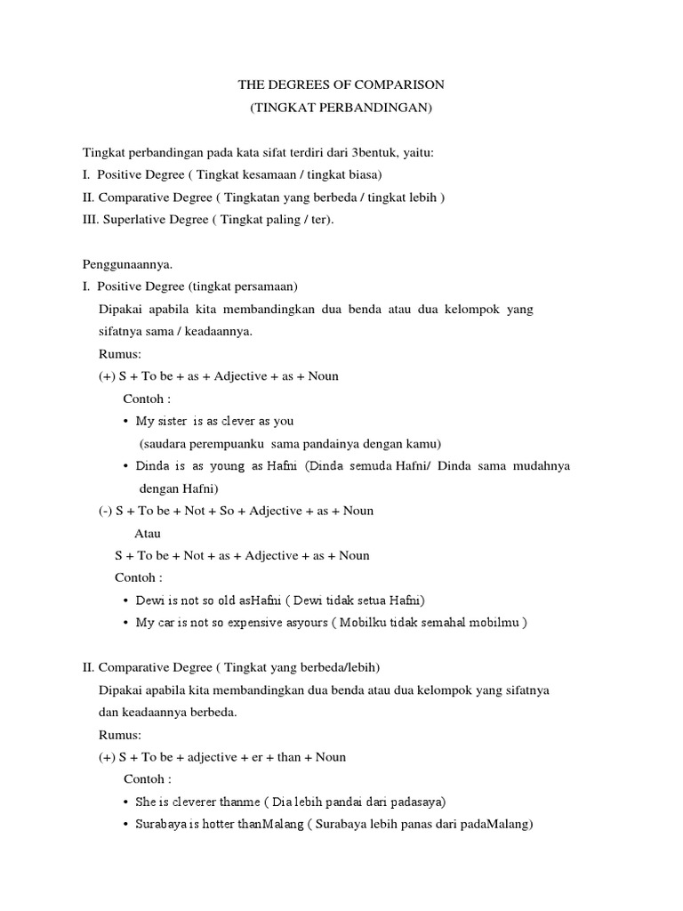 Secara definisi, degree of comparison dapat diartikan sebagai bentuk perbandingan kata sifat (adjective) atau kata keterangan (adverb). ·putri is as beautiful as her mother. Adjective yang 2 syllableberakhiran "er, le, ow, some, dan consonant +y e.g. 2.untuktipe perbandingan yang ini, kita dapat menggunakan struktur dibawah ini: Comparative degree comparative degree adalah suatu bentuk kalimat yang digunakan untuk membandingkan 2 hal yang tidak setara, yang satu memiliki kelebihan diantara yang lainnya.